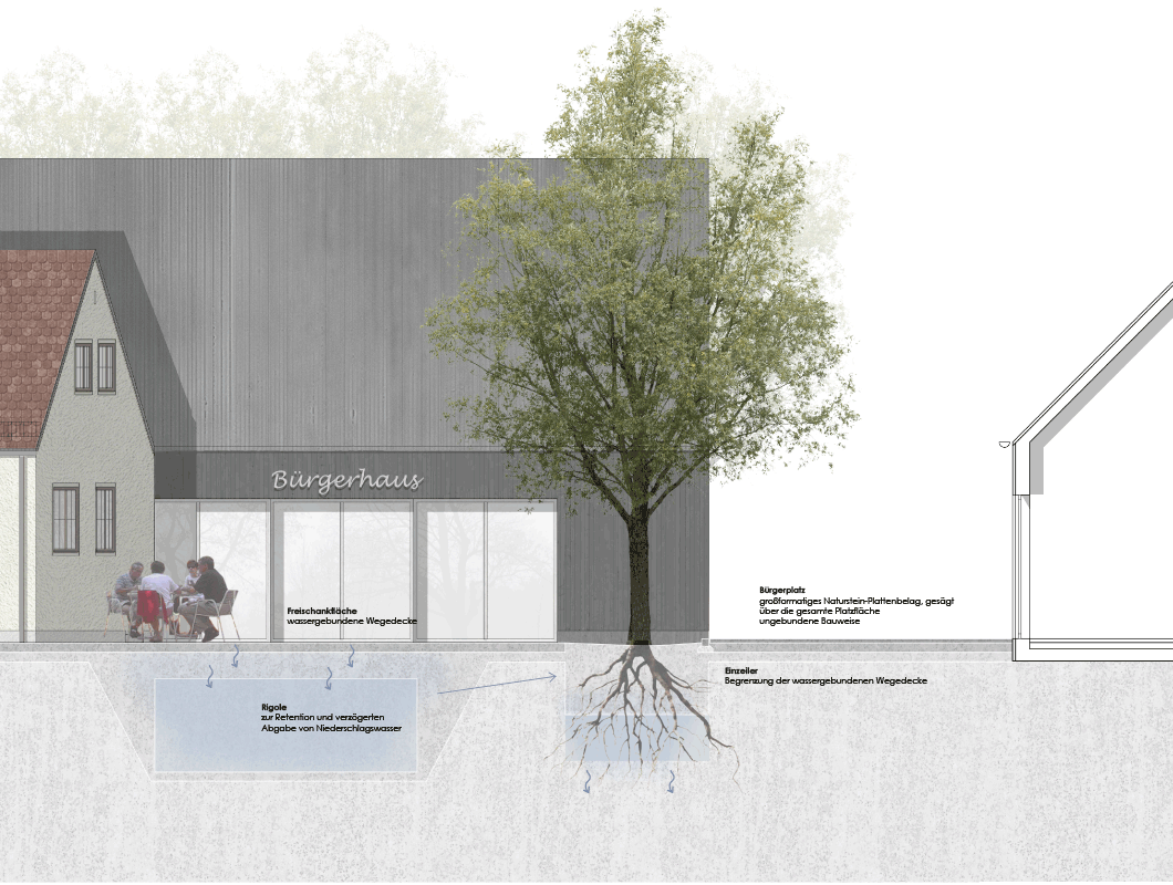 Die Ortschaft Greifenberg war bisher geprägt von einer klaren Straßendorf- Typologie. Diese beginnt sich aufgrund der stetigen Entwicklung Stück für Stück aufzulösen. Unsere Antwort darauf ist eine Ergänzung durch eine neue Mitte mit einem räumlich stark gefassten Platz, der alle Nutzungen der Dorfgemeinschaft beinhaltet. Als möglichen Ort sehen wir die städtebaulich spannendste Stelle, gleich neben der Kirche um das bisherige Rathaus, wo der Straßenverlauf der Hangkante am nächsten kommt. Der Neue Platz wird so zum Bindeglied zwischen dem Siedlungskörper und der Topografie bzw. dem Grünraum. Durch ein behutsames Freischneiden des Hangbewuchses wird von hier aus der Blick über den Ammersee ermöglicht. Um den vorhandenen Straßenraum zu stärken, wird sowohl der Platz als auch die Straße des Kerngebietes in einem einheitlichen neuen Pflasterbelag ausgeführt.